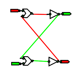 Reading this diagram: Red is false, green is true. The triangles are inverters; the blazes are OR gates (I'll pretty them up later). The flags on the right are inputs; the flags on the left are outputs. The green circles are inputs and outputs - the points where gates associate with each other. They're only shown for debugging.