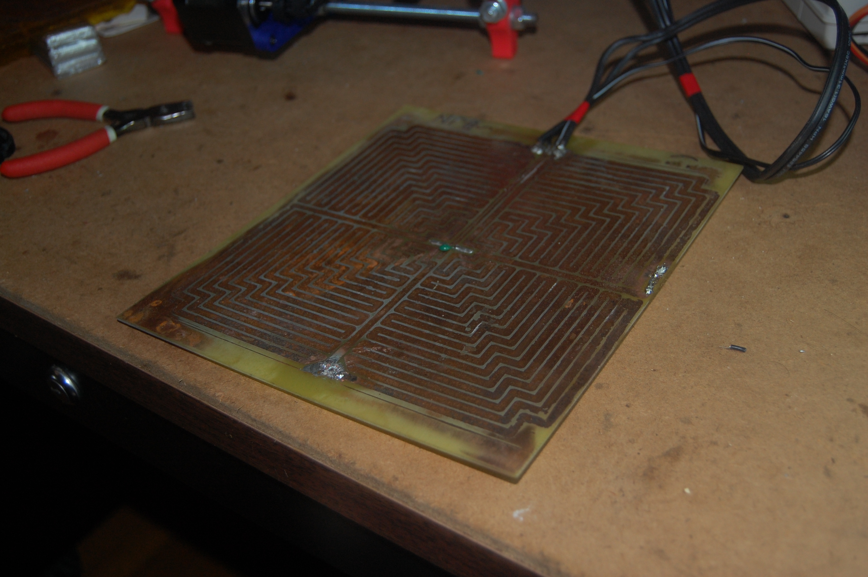 While I was testing the bed, I noticed that the four quadrants have different temperatures. Presumeably, the vinegar solution etched some areas thinner than others without breaking any traces. It's only 10°C or so, and I'm not too concerned.