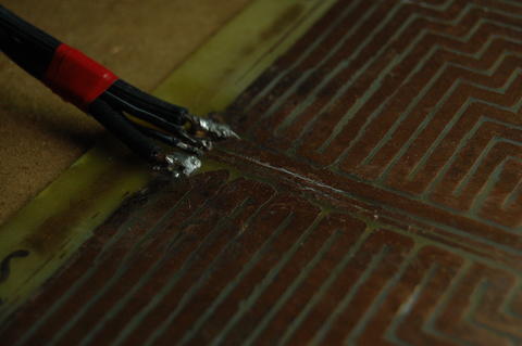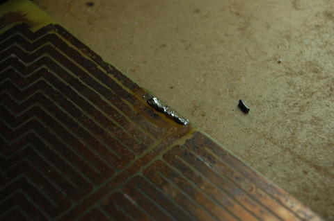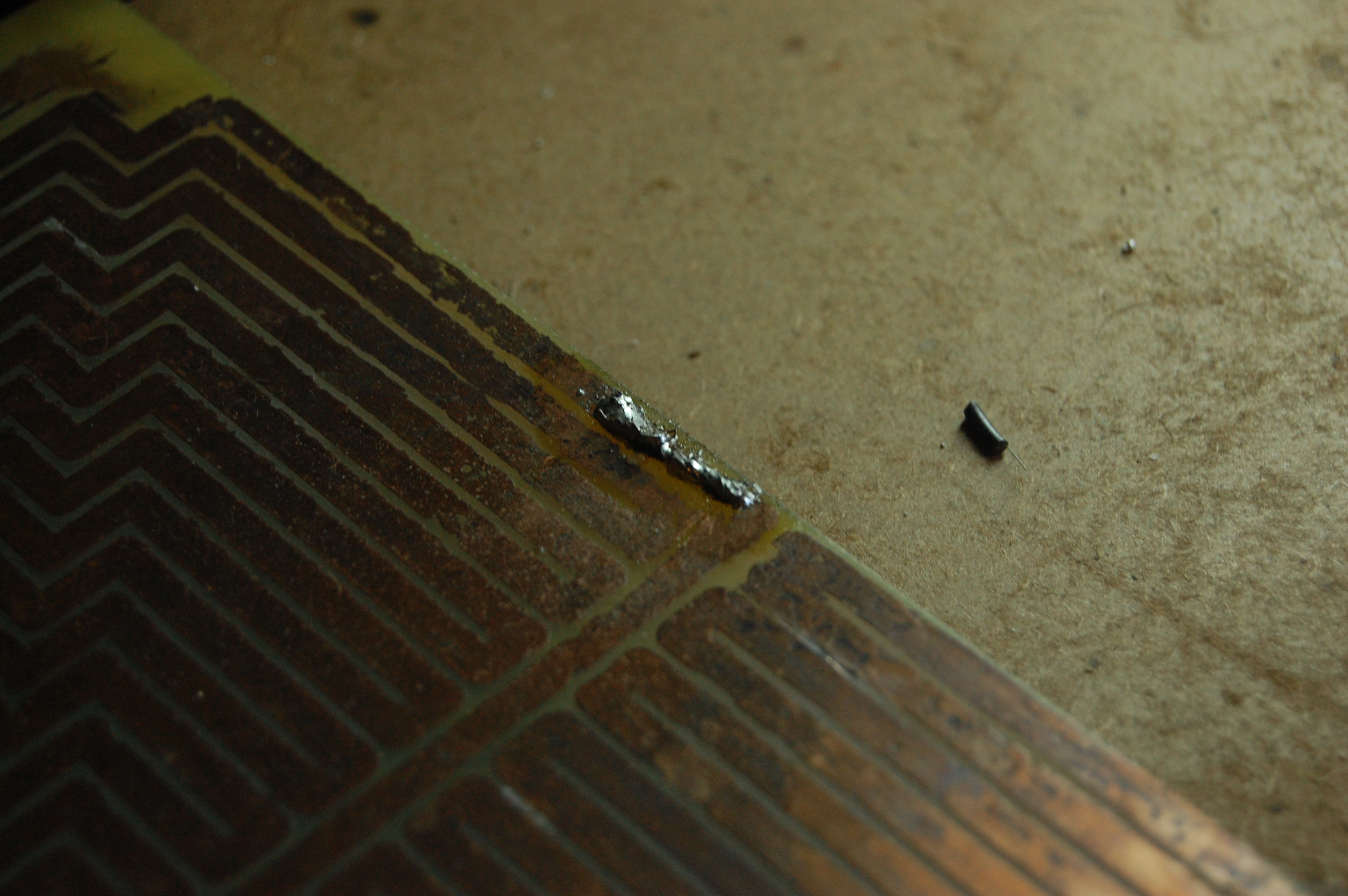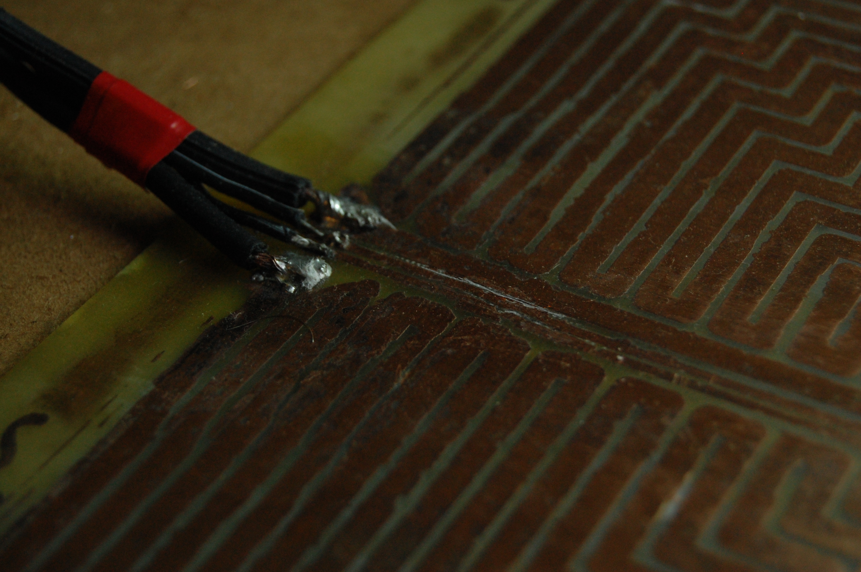 For my second attempt, I replaced the toner on the board. The toner transfered well in most areas, but peeled around the edges. I'm not sure if I did a poor job, or if thermal expansion of copper broke the toner bond. Regardless, Sharpie patched up the missing bits. I also switched to 50/50 HCl and H2O2. It worked beautifully. The acid ate through what remained of the copper in about 10 minutes, and I fished the board out with tongs. The thermistor was easy to solder on, and the power leads weren't much harder.
