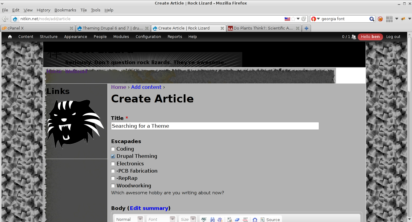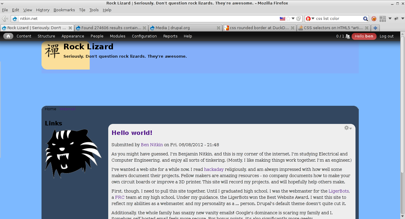 Last night, I decided to create a custom theme using the Zen framework. This morning, I changed the theme to use a fixed layout (to make things easier on my brother, the artist). I also installed a variety of background images for him to customize: a background, a header, a menu, a repeating sidebar, and a footer (image 1).