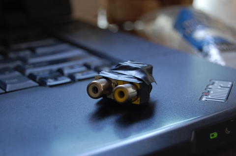 Final notes: The new adaptor is female, instead of male. Fortunately, male-male 3.5mm cables are fairly common. They also make the system more Goldbergian and convoluted. Perhaps it's my imagination, but I fancy that the new adaptor looks a bit like a starship, with two RCA engines at the back and a tiny little 3.5mm cannon on the front. It even includes visual cloaking. Okay, camo.