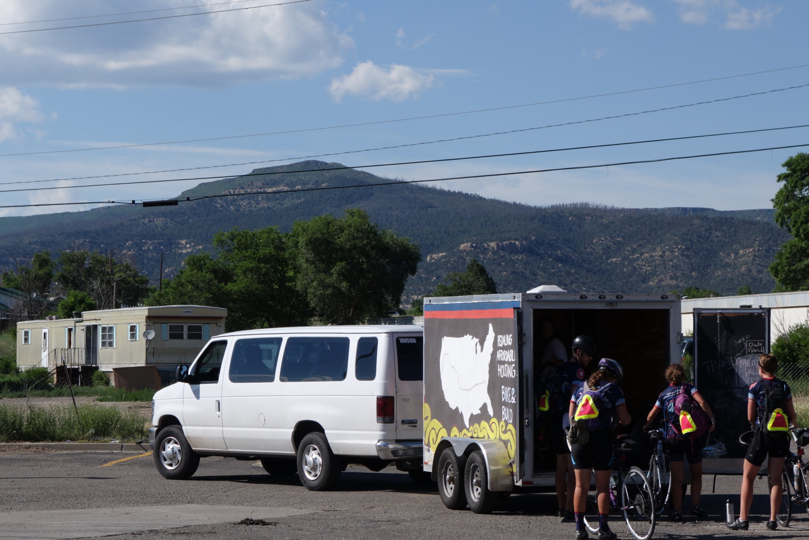Unfortunately, bikes were banned on the highway we would have ridden into Colorado. To cover the last 20 miles into Trinidad, we loaded bikes into the emptied trailer 8 at a time and drove across the state line.