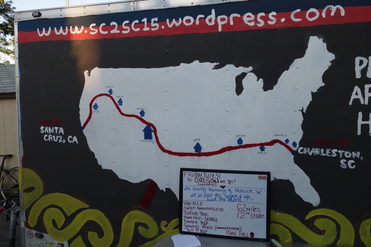 By Ben Nitkin on May 11, 2016 at 17:38 We biked to Oregon. How did we bike to Oregon? Just getting the bikes ready. Oil the chain, pump the tires, ... Our daily whiteboard - 62 miles is short There may have been some mild pilfer-age. Some of that stuff turned into dinner! We found this really unassuming bakery. It was full of tortillas! Like, really full. They were super-nice and gave us a few fresh tortillas to take back and share. Sundown on another day on the road Today's ride took us from Boise, ID to Ontario, OR. That's the penultimate state crossing!We passed a little tortilla bakery, and they offered us a few bags of tortillas to take back and share! Fresh tortillas are delicious.