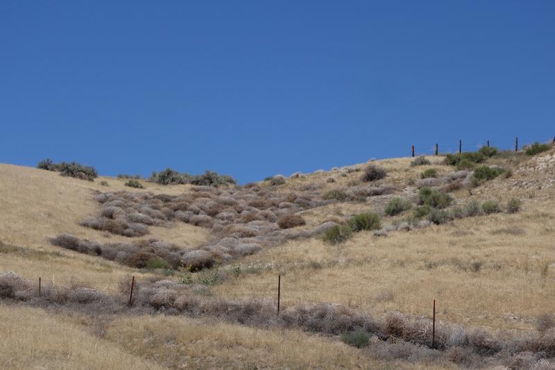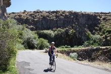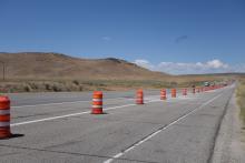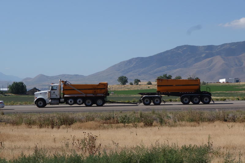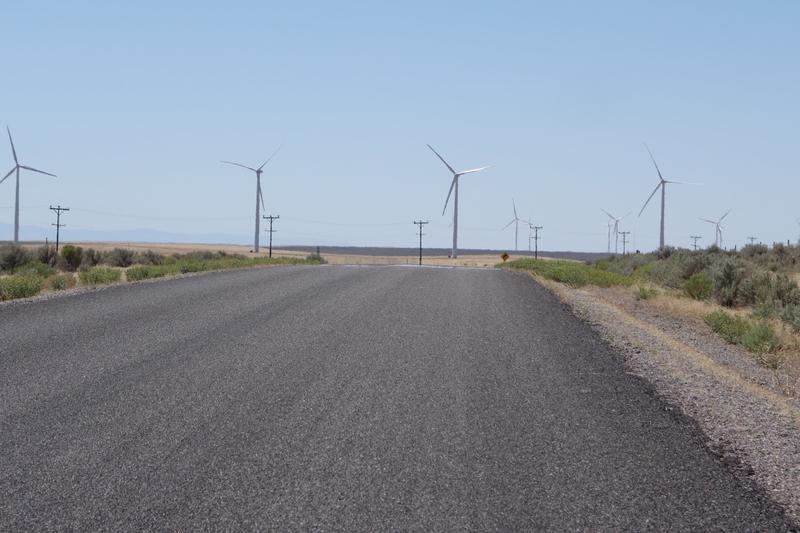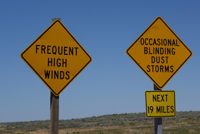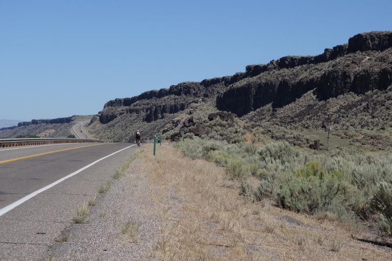 Later in the day, we pulled into I-84 (it's just about the only paved road between here and Boise) for a spell. The interstate wasn't too busy, and had a wide shoulder. For a few miles, resurfacing work forced all traffic into the right lane, so we had a12' buffer from traffic.