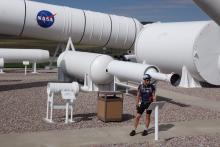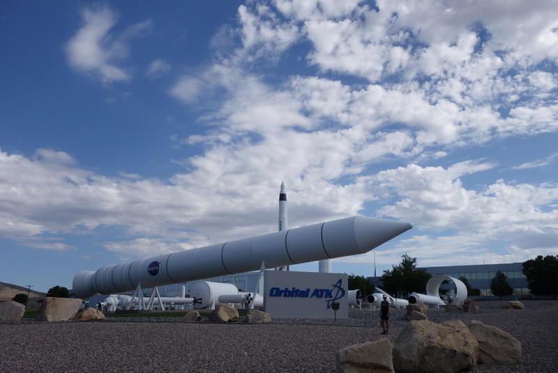 Asking the way we passed a Orbital facility where they built and tested rockets. It's odd, to say the least, to see an office building designed for a hundred people 40 miles from anywhere. Out in front, they built a rocket garden of engines Orbital had some part in building. Their centerpiece was the Space Shuttle Solid Rocket Booster, which was around 100' tall and 12' or so in diameter. It is huge.
