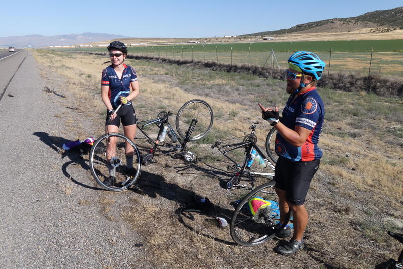 The ride today took us from the small town of Brigham City to the smaller town of Snowville. Around here, we only pass towns every 20-50 miles, so anywhere we can stop is a good place. We rode about 60 miles, mostly on a quiet section of I-84W, the same road I take to get from home to school.
