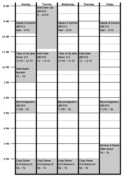 As the school year began, I found myself frustrated with scheduling. My schedule is simple enough. I plugged it into my calendar, memorized it, and voila. (Except that I keep going to the wrong room. Someone put one of my SparkE classes on the CivE floor.)