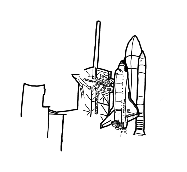 The Space Shuttle Atlantis, as it lifts off from Cape Canaveral. (Still a work in progress. I like how the gantry loses detail near the shuttle's base, but want to add some smoke and fire.)